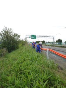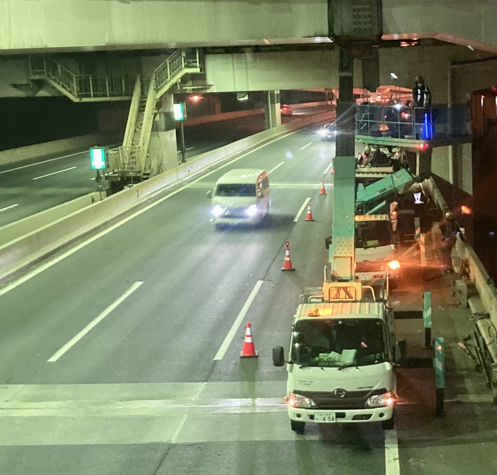 交換作業は基本的に走行車両が少ない夜間の時間帯に行います。地道な作業ですが高速道路利用者の安全を確保する為に大変重要な作業です。